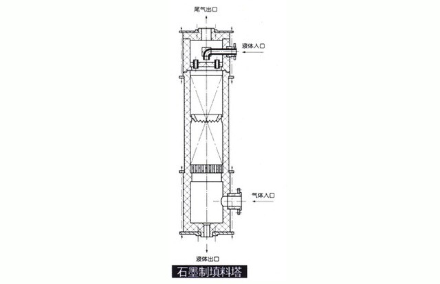 石墨制塔類設備主要有篩板塔泡罩塔、填料塔、浮閥塔等,用作對有機產品、鹽酸、HCL氣體、S02氣體等腐蝕性介質之吸收、濃縮、解析、蒸餾、精餾、過濾、洗滌等.塔徑可至0 200-01500.也可按用戶來圖制作.亦可按用戶工藝條 件代為設計、制造及安裝調試。其中填料塔尤多用于含HCL氣體,S02氣體之尾氣處理,消除環境污染之同時回收有用成分。除圖示結構外另有氣體由下部進入之 結構,尤其適用于HCL氣體含