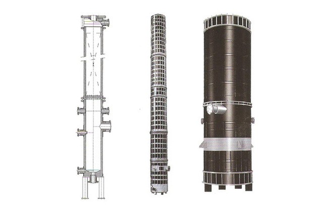 主要用于硫酸鉀生產系統,成功替代了進口設備。該設備要求頂部零部件耐溫540度左右,下部為多節式組合,介質經多次再分配冷卻、吸收,介質出口溫度55度左右。設備整體全部采用石墨材料。我公司經特殊處理,成功解決了設備耐高溫、雙向耐腐蝕等諸多技術難題,技術水平為國內行業之最。